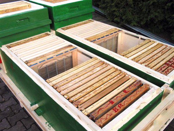 - Die bei starken Völkern nach dem Abschleudern auftretende Entwicklung zu Bienenbärten nutze ich positiv fürerneute Volksbildungen.Durch Teilen der Völker und Zusetzen von Königinnen werden wieder neue Völker mit eigenen Brutnestern erstellt. So können in einer Doppeltrogbeute nach Trachtendevorübergehend mehrere Königinnen zum Einsatz kommen.
