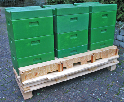 - Da sich 3 Völker im Einsatz befinden, werden schwach entwickelte Völker oder das Ausfallen eines Volkes durch die übrigen Beuten ausgeglichen.