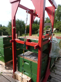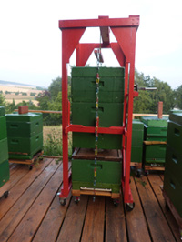- Ein Lift mit Flaschenzug wird über das freistehende Magazinvolk gefahren. Nun können bis zu 4 Zargen des Volkes angehoben und arretiert werden, um den Rollwagen mit der freigelegten Zarge (z. B. Brutraum) zur Bearbeitung herauszuziehen.