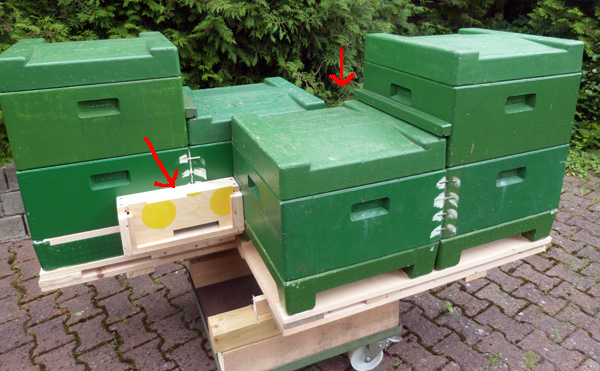 - Nach wenigen Eingriffen und Veränderungen an handlesüblichen Seegeberger Magazinböden und Magazinen (Herstellung einer Trogbeute aus 2 Magazinen) und der versetzten Anordnung zweier entgegengesetzter Trogbeuten ergeben sich 2 winkelförmige Bienenumleitungsmöglichkeiten.